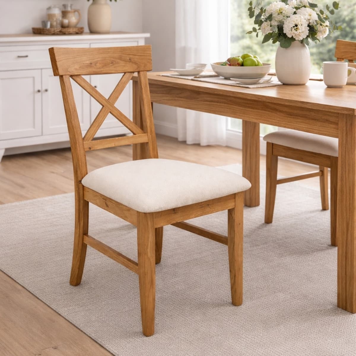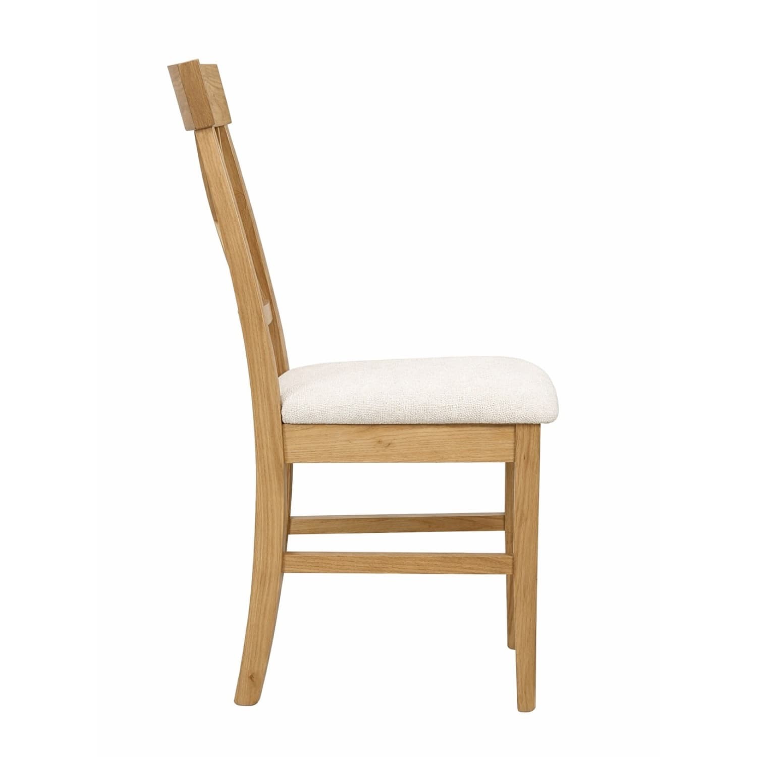Konstrukcja wykonana z litego drewna dębowego zachwyca naturalnym usłojeniem i ciepłym odcieniem, który wprowadza do wnętrza przytulność i elegancję. Tapicerowane siedzisko zwiększa komfort codziennego użytkowania i dostępne jest w różnych wariantach kolorystycznych, co umożliwia dopasowanie krzesła do indywidualnej aranżacji.