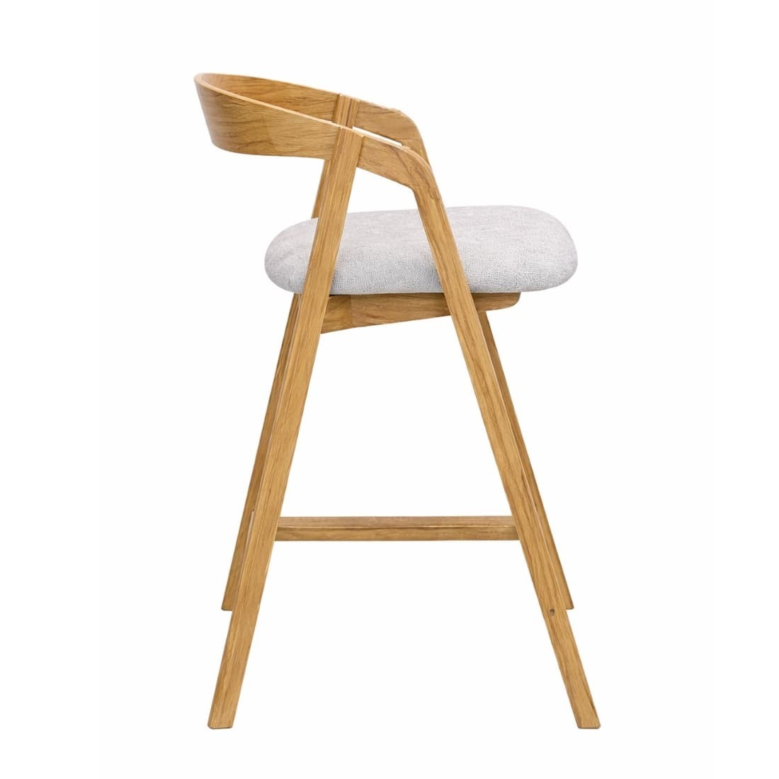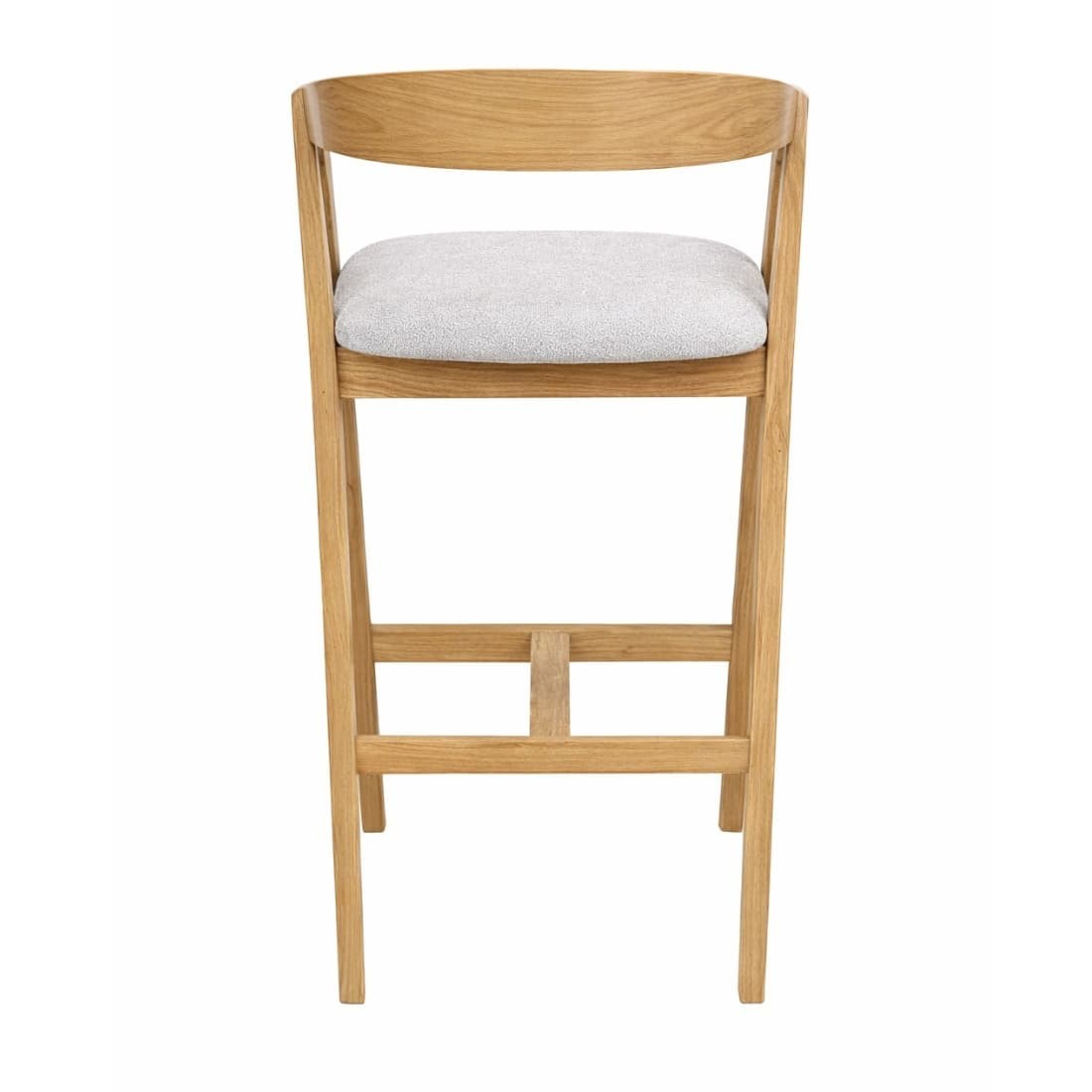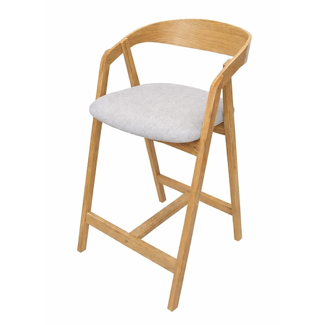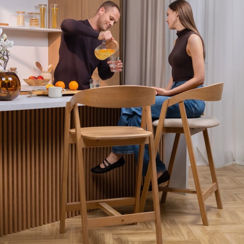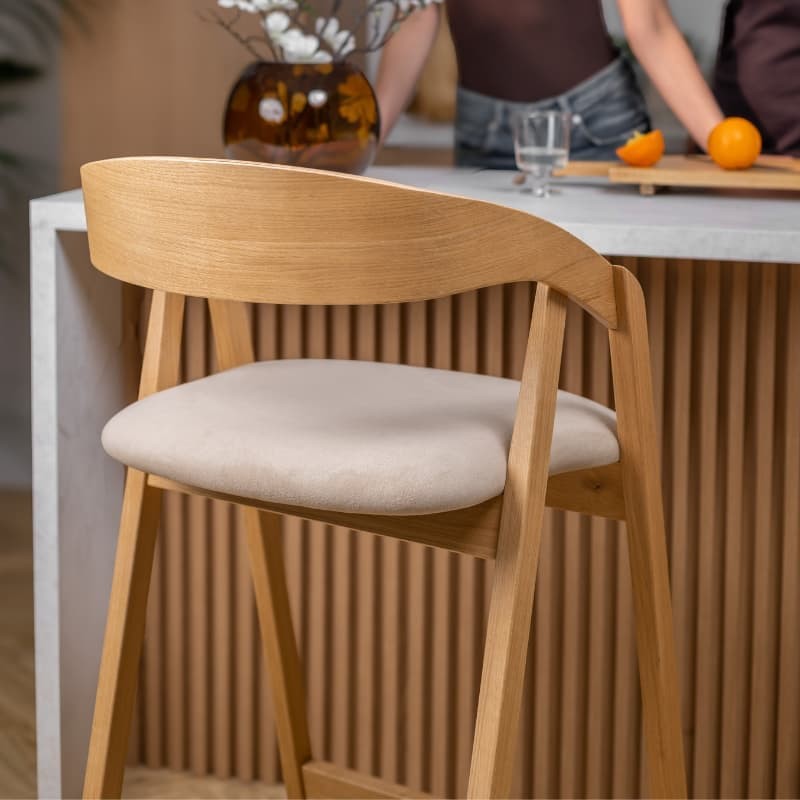 Konstrukcja wykonana z litego drewna dębowego wyróżnia się stabilnością oraz wyraźnym, naturalnym usłojeniem. Profilowane oparcie zapewnia komfort siedzenia i wygodne podparcie pleców, a tapicerowane siedzisko zwiększa wygodę nawet podczas dłuższego użytkowania. Siedzisko dostępne jest w różnych wariantach kolorystycznych, co pozwala dopasować hoker do stylistyki wnętrza.