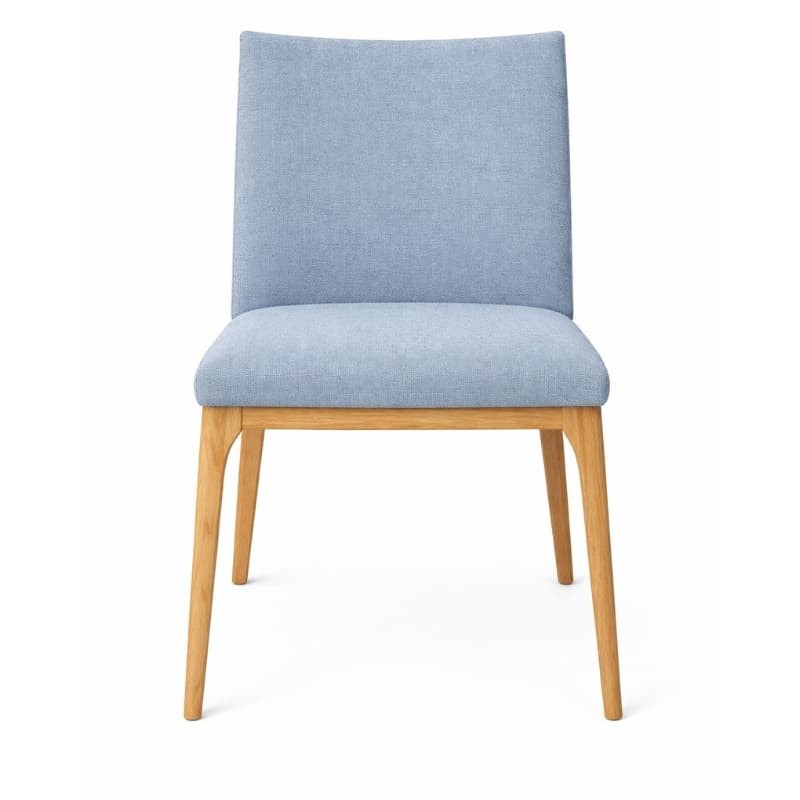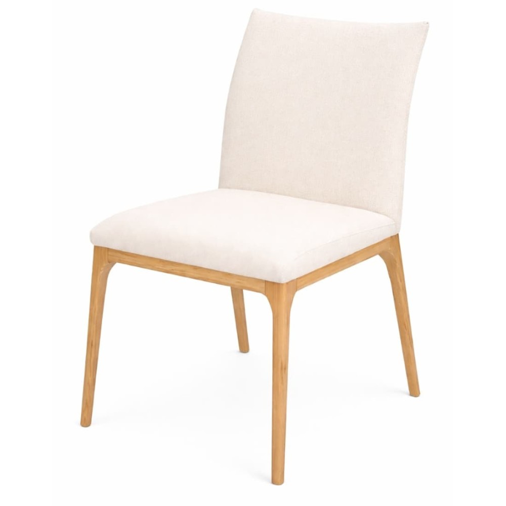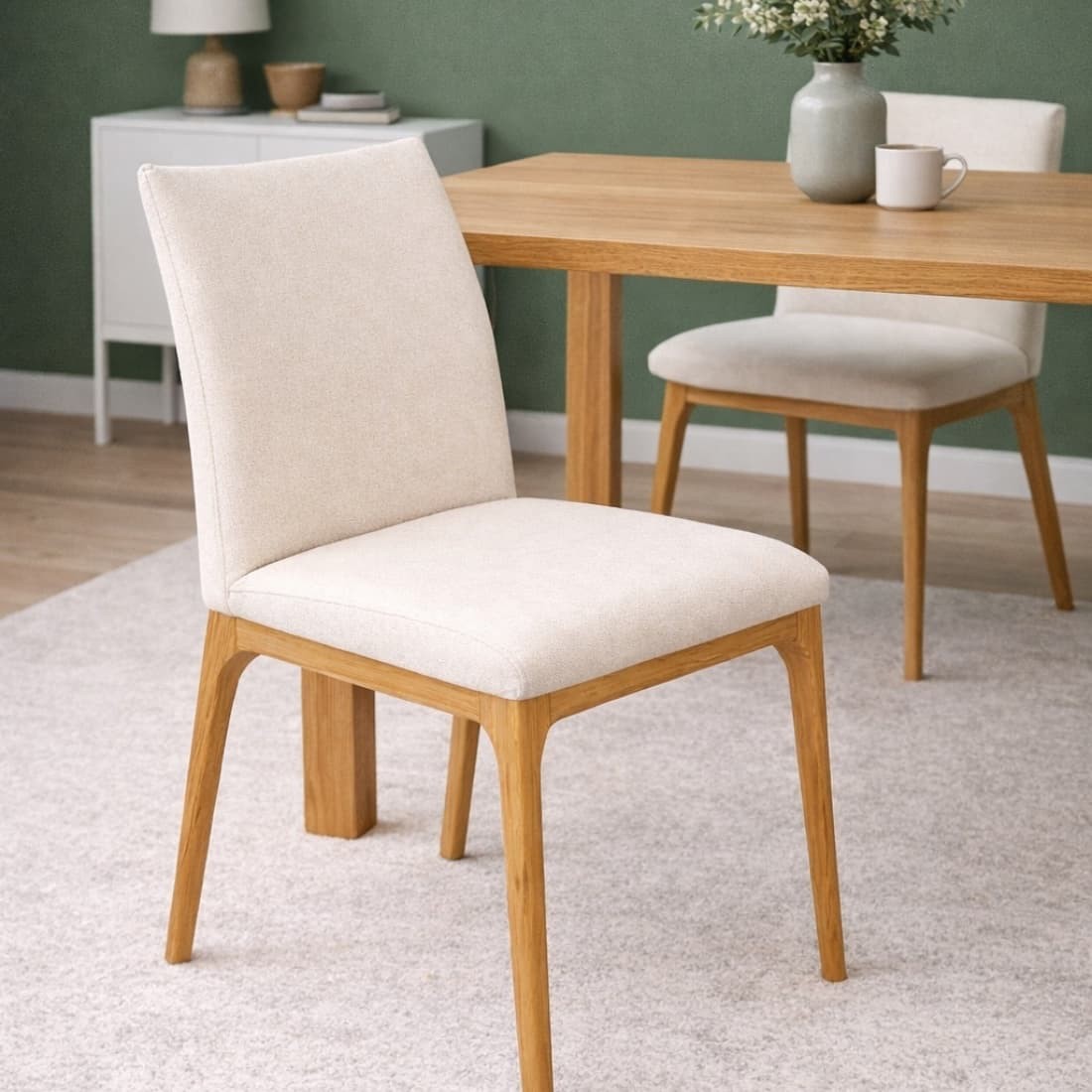 Konstrukcja wykonana z litego drewna dębowego wyróżnia się naturalnym usłojeniem i ciepłym odcieniem, który doskonale współgra z tapicerowanym siedziskiem i oparciem. Miękka tapicerka zwiększa wygodę codziennego użytkowania i dostępna jest w różnych wariantach kolorystycznych oraz tkaninach, co pozwala dopasować krzesło do aranżacji wnętrza.
