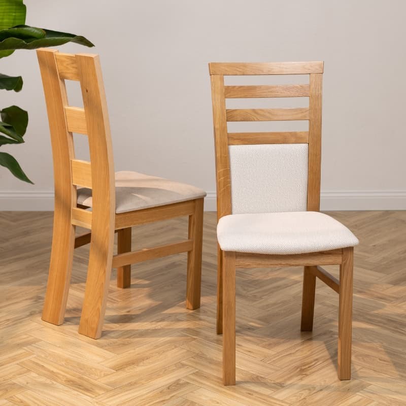 Konstrukcja wykonana z litego drewna dębowego zachwyca naturalnym usłojeniem i ciepłym odcieniem. Tapicerowane siedzisko zapewnia komfort codziennego użytkowania i dostępne jest w różnych wariantach kolorystycznych oraz tkaninach, co pozwala dopasować krzesło do indywidualnej aranżacji wnętrza.