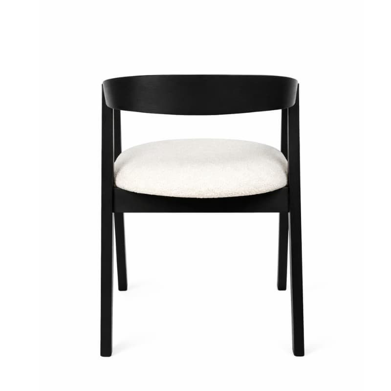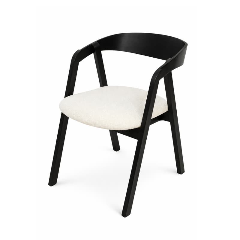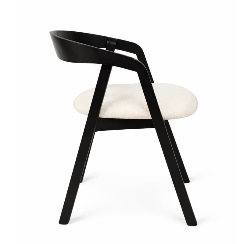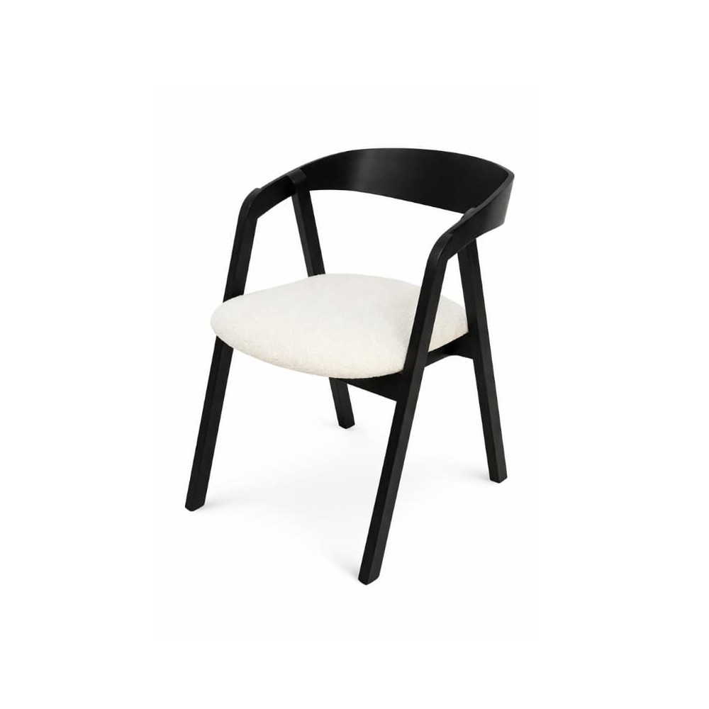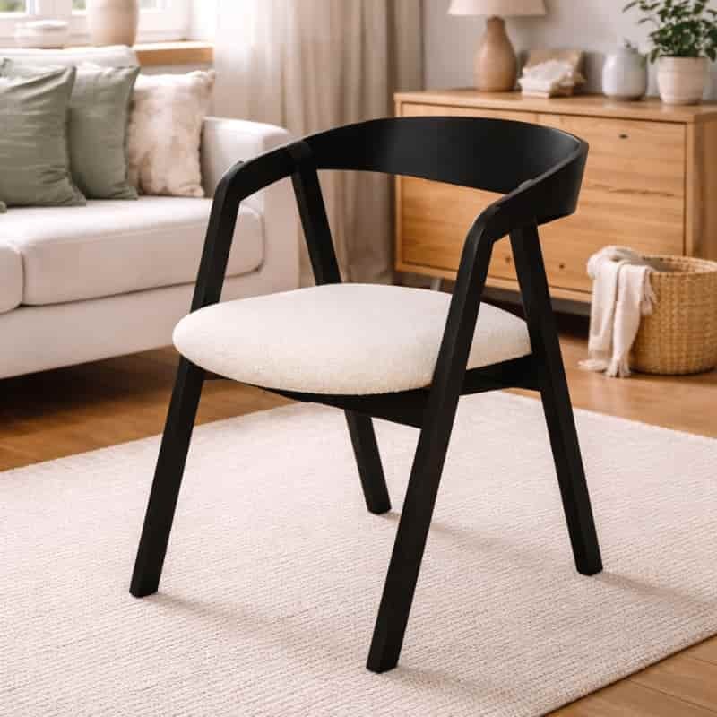 Czarna drewniana rama nadaje meblowi wyrazistości i podkreśla jego nowoczesny styl, natomiast miękkie, tapicerowane siedzisko w jasnej tkaninie wprowadza subtelny kontrast oraz zapewnia komfort codziennego użytkowania.