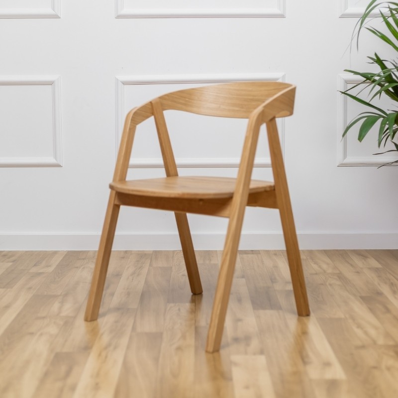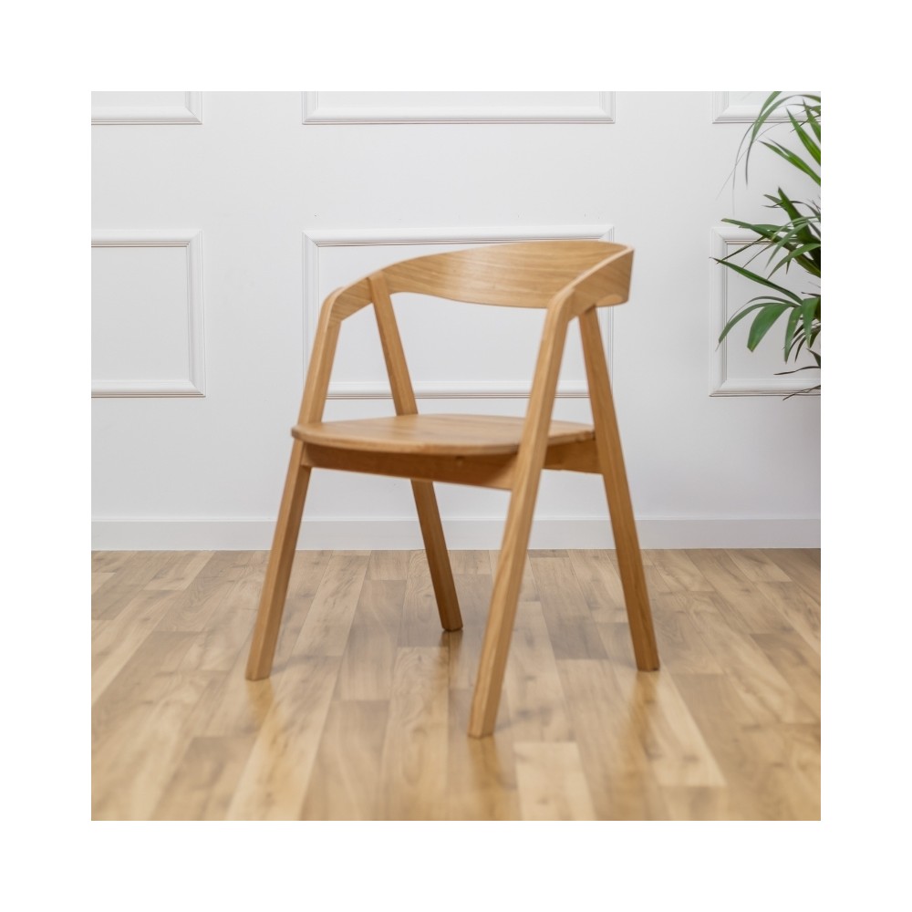 Nowoczesne i eleganckie krzesło z litego drewna dębowego o subtelnym, organicznym kształcie. Szerokie, ergonomicznie wyprofilowane oparcie oraz zintegrowane podłokietniki zapewniają komfort użytkowania, mimo braku tapicerki. Całość wykonana z naturalnego drewna, co nadaje mu autentyczny, ponadczasowy charakter.
