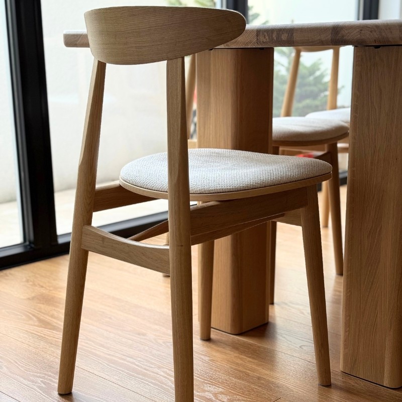 To nowoczesne krzesło łączy naturalne drewno z tapicerowanym siedziskiem w jasnej tkaninie, tworząc subtelną i harmonijną całość. Profilowane, drewniane oparcie w kształcie łuku zapewnia wsparcie dla pleców i nadaje krzesłu wyjątkowy charakter.