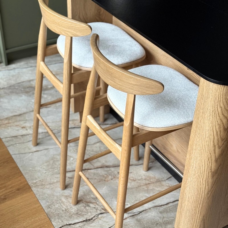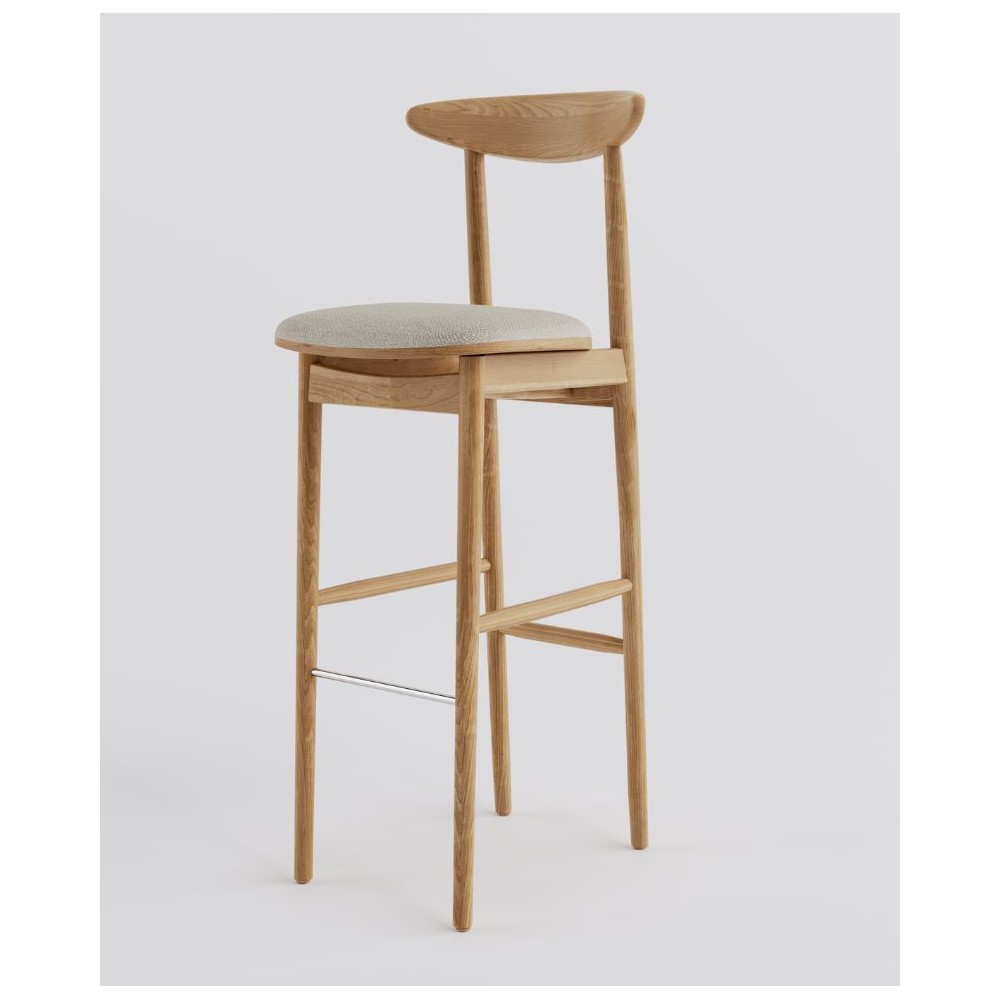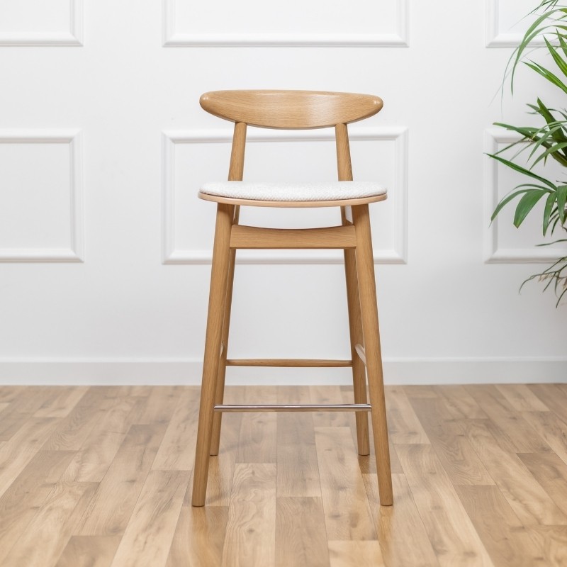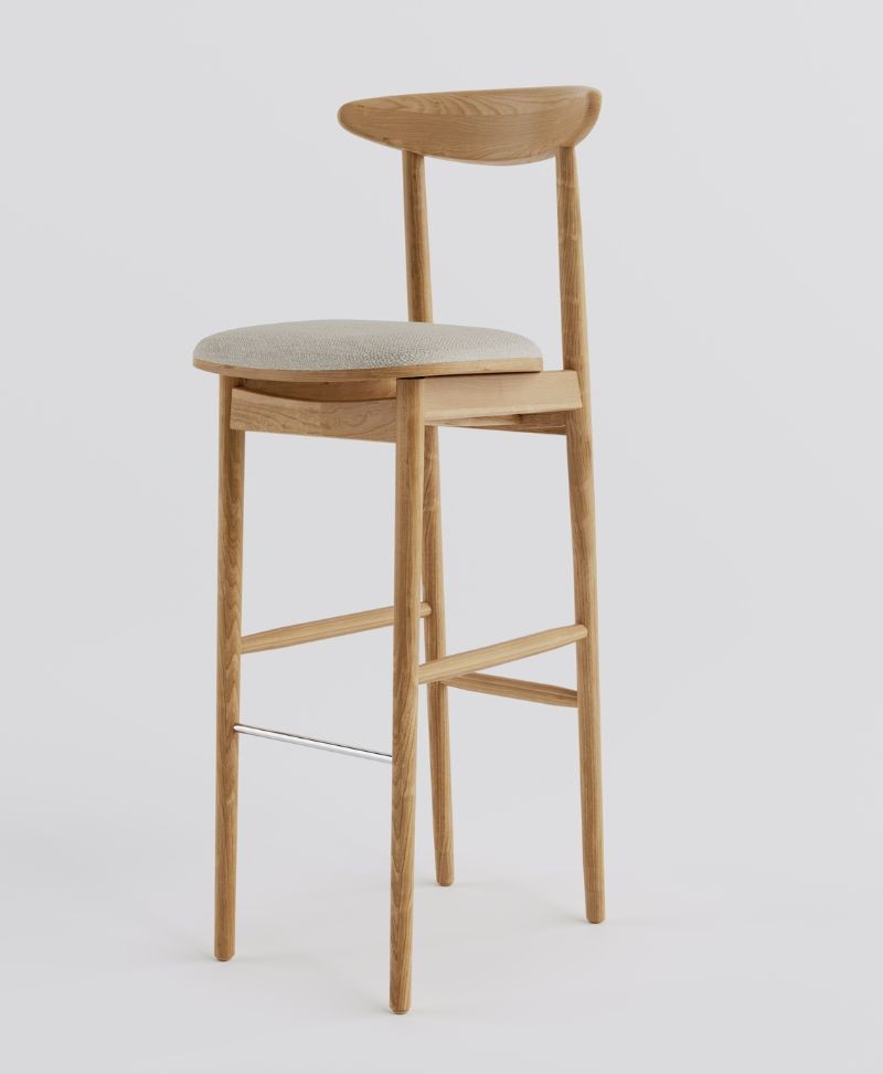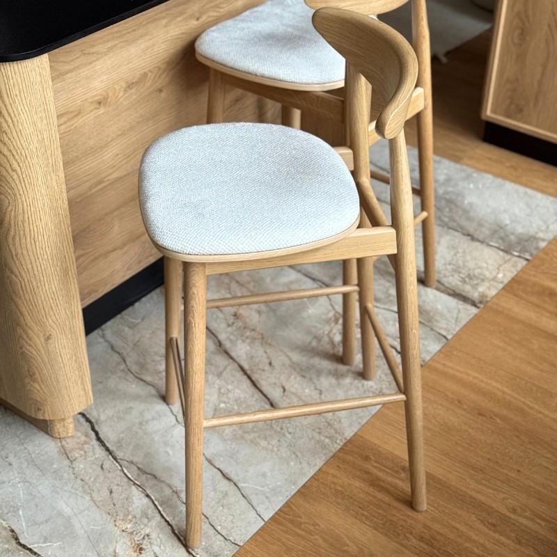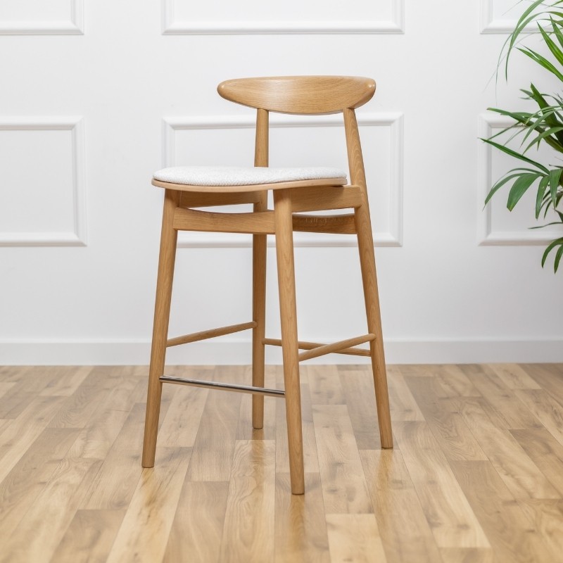 Ten elegancki hoker barowy to doskonałe połączenie litego drewna z tapicerowanym siedziskiem w jasnej, strukturalnej tkaninie. Profilowane drewniane oparcie zapewnia wygodę bez nadmiaru formy, a smukła konstrukcja nadaje krzesłu lekkości i subtelności.