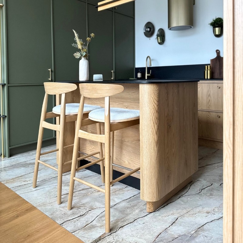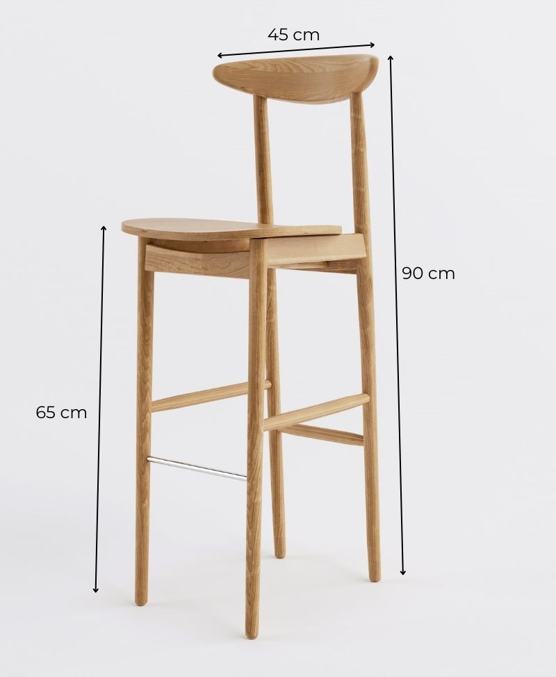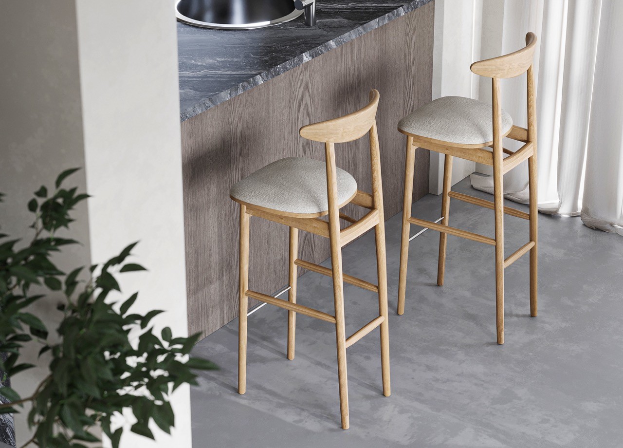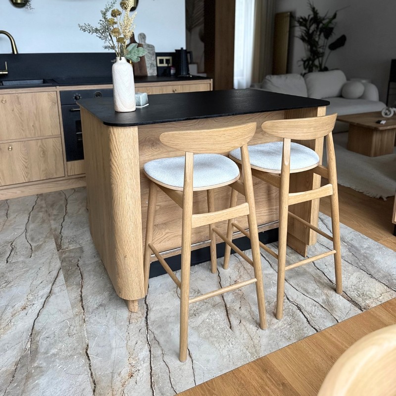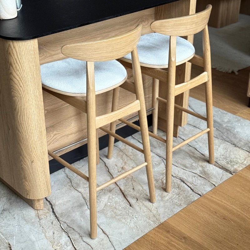 Ten elegancki hoker barowy to doskonałe połączenie litego drewna z tapicerowanym siedziskiem w jasnej, strukturalnej tkaninie. Profilowane drewniane oparcie zapewnia wygodę bez nadmiaru formy, a smukła konstrukcja nadaje krzesłu lekkości i subtelności.