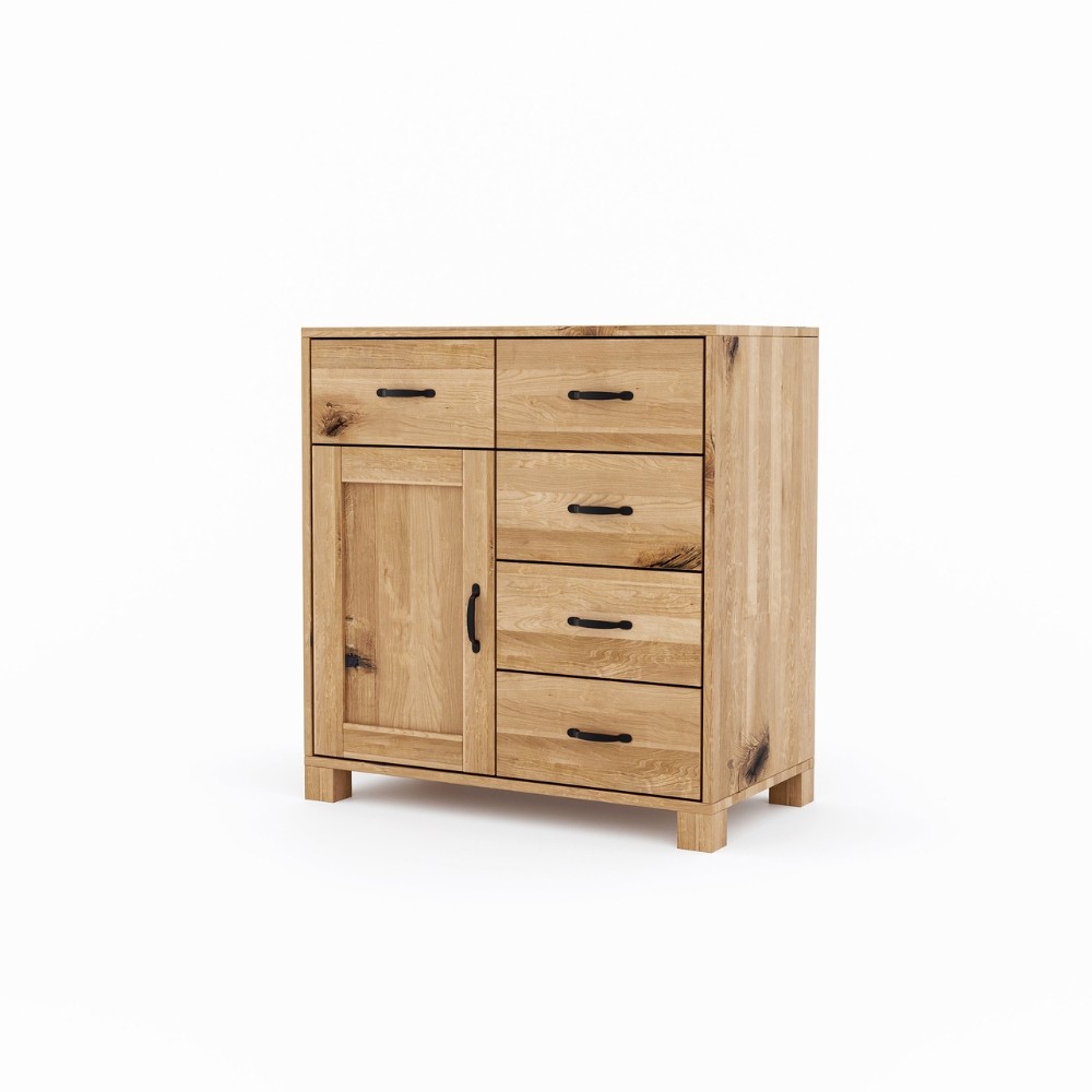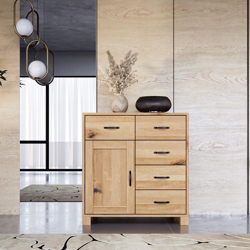 Komoda TEKO 5s1d z litego dzikiego dębu wyróżnia się autentycznym wyglądem – widoczne sęki, naturalne pęknięcia i zróżnicowany rysunek słojów czynią każdy egzemplarz unikalnym. Jej funkcjonalny układ z pięcioma szufladami i jednym frontem z drzwiczkami pozwala utrzymać idealny porządek.