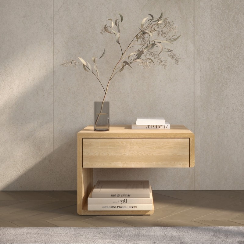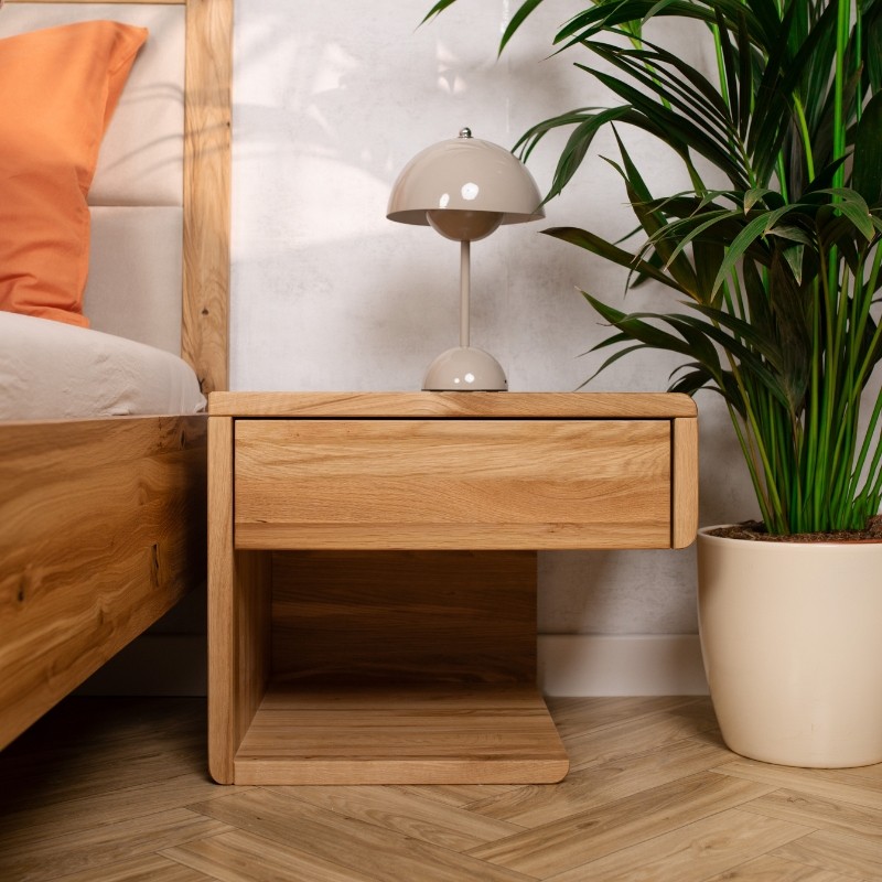 Szafka nocna ZEN PLUS z litego dębu – minimalistyczna forma, solidne wykonanie. Prawa strona łóżka.