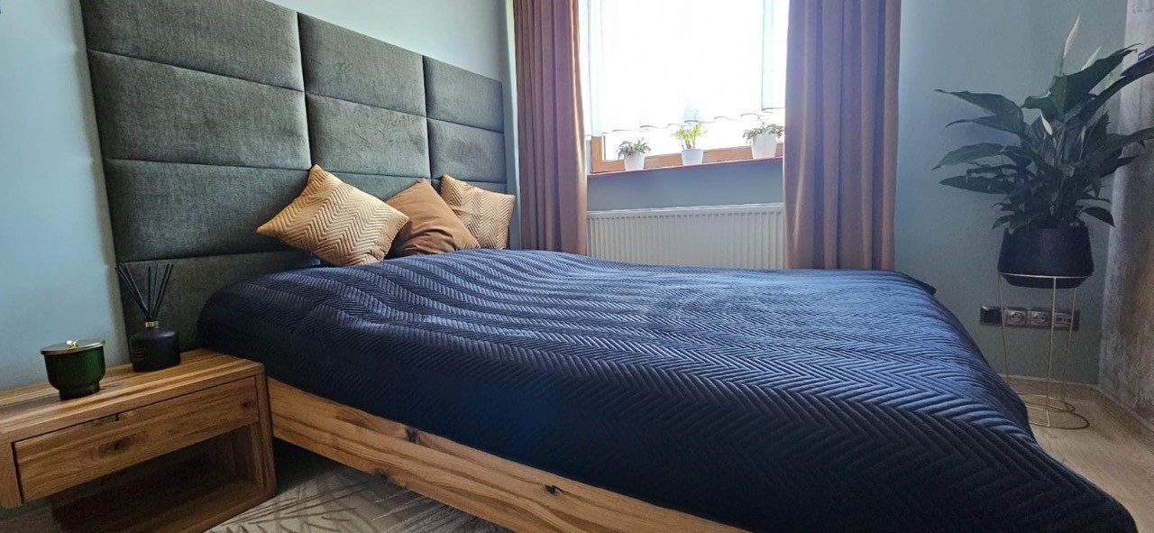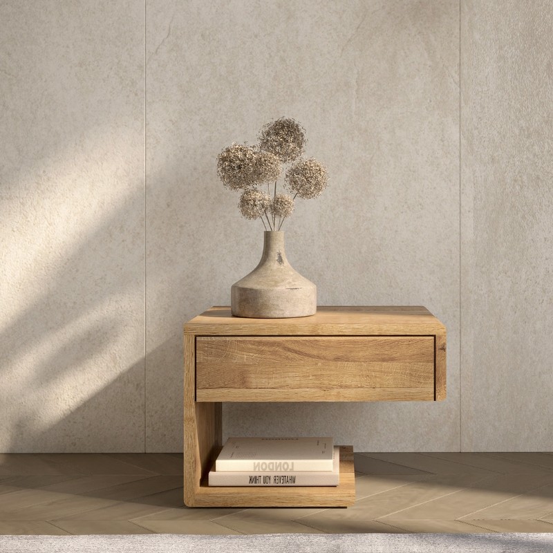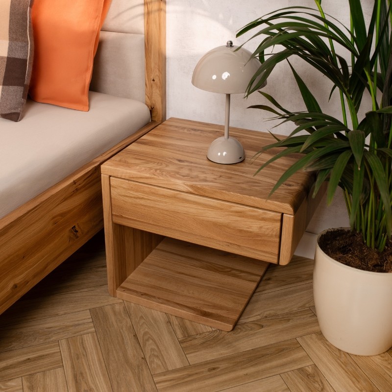 Szafka nocna ZEN PLUS z dzikiego dębu – surowe piękno i codzienna funkcjonalność. Prawa strona łóżka.