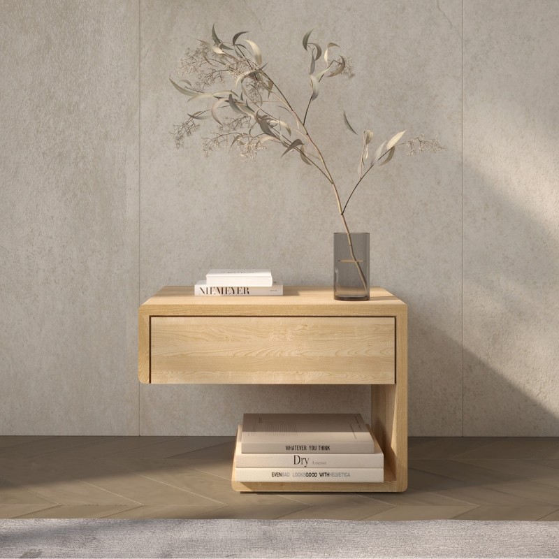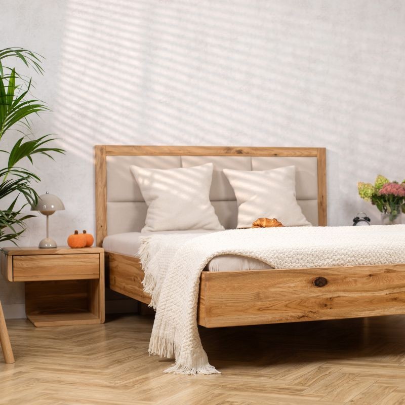 Szafka nocna ZEN PLUS z litego dębu – minimalistyczna forma, solidne wykonanie. Lewa strona łóżka.
