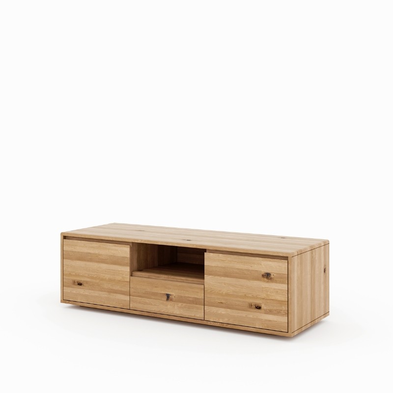 Komoda RTV ZEN z litego dzikiego dębu to mebel o wyrazistym charakterze. Naturalne sęki, pęknięcia i nieregularne usłojenie czynią każdy egzemplarz unikatowym, a prosty design podkreśla jego autentyczność.