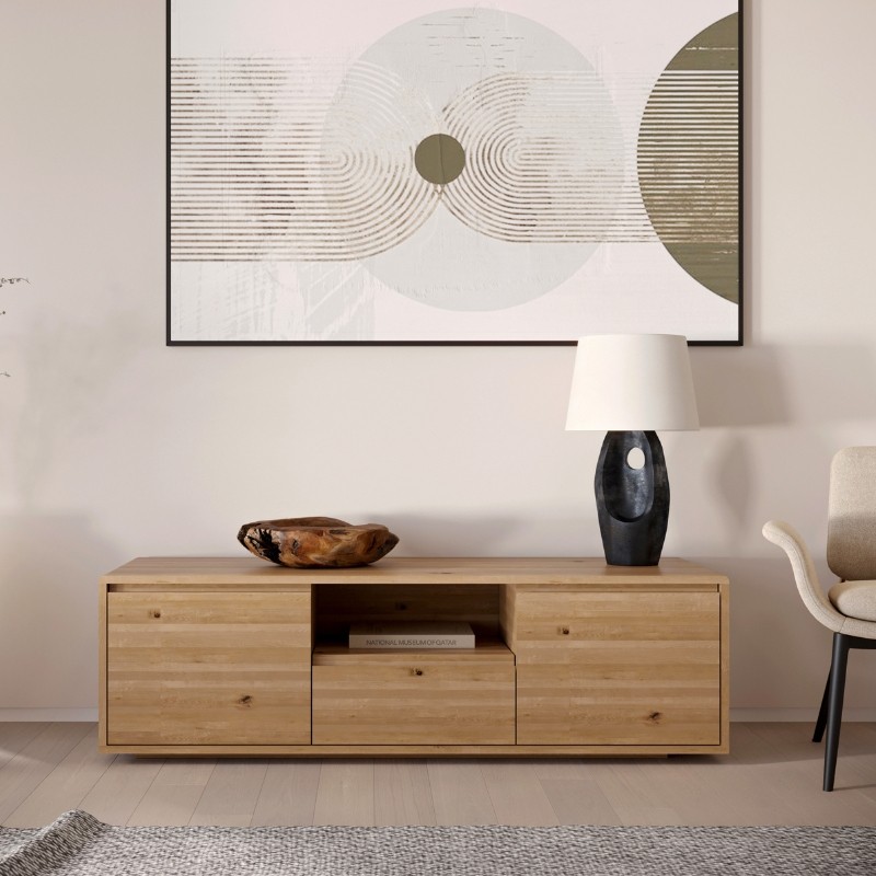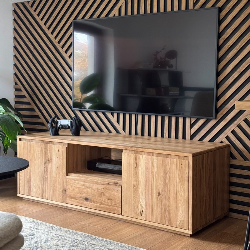 Wykonana z litego dzikiego dębu, zachwyca naturalną strukturą i wyjątkowym rysunkiem drewna. Lakierowana powierzchnia chroni materiał, zachowując jego surowy urok. Praktyczny układ półek i zamykanych szafek pozwala na wygodne rozmieszczenie telewizora, konsol, dekoderów i akcesoriów, gwarantując estetyczny porządek w salonie.