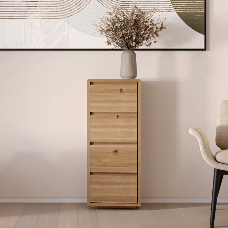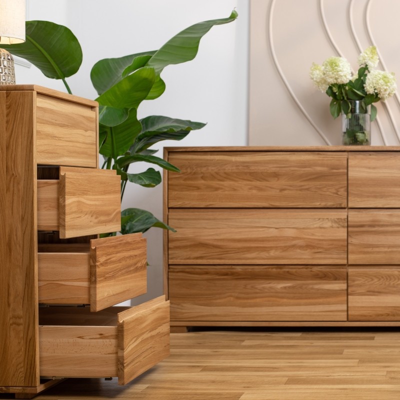 W całości wykonany z litego dzikiego dębu, zachwyca autentycznym charakterem i solidnością. Cztery pojemne szuflady zapewniają wygodne przechowywanie, a lakierowana powierzchnia podkreśla surowe piękno drewna i chroni je na lata.