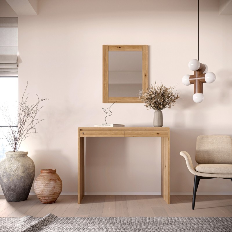 Wykonana z litego drewna dzikiego dębu, toaletka zachwyca nieregularnym usłojeniem, sękami i pęknięciami, które czynią każdy egzemplarz unikalnym. Lakierowana powierzchnia zabezpiecza drewno, jednocześnie eksponując jego naturalne piękno. Prosta forma, duże lustro w ramie z drewna i praktyczne szuflady tworzą harmonijną całość – elegancką i użytkową zarazem.
