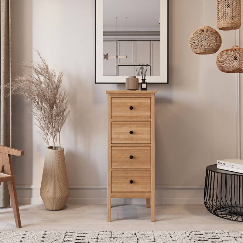 Cztery praktyczne szuflady zapewniają wygodne przechowywanie drobiazgów, dokumentów, tekstyliów lub akcesoriów, pomagając utrzymać porządek w sypialni, salonie, przedpokoju lub gabinecie. Naturalny rysunek drewna dębowego nadaje komodzie wyjątkowego charakteru i podkreśla jej ponadczasowy styl.