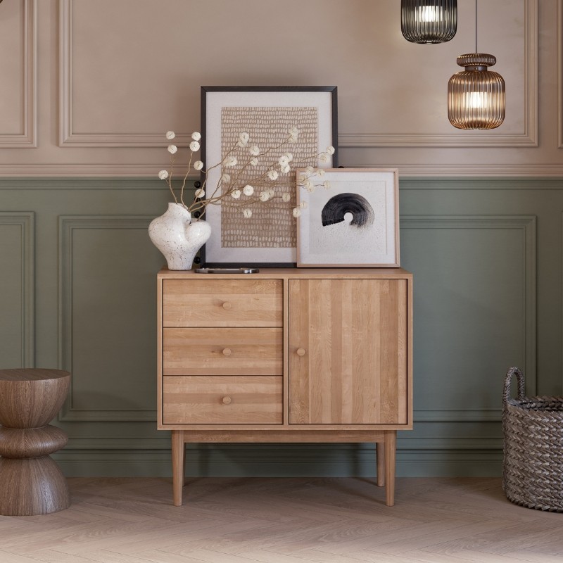 Trzy pojemne szuflady i funkcjonalna szafka za pełnym frontem pozwalają wygodnie uporządkować dokumenty, tekstylia, porcelanę czy wszelkie drobiazgi domowe. Naturalne usłojenie dębu nadaje jej niepowtarzalny charakter, a smukłe nogi oraz minimalistyczne uchwyty podkreślają lekkość typową dla skandynawskich wnętrz. To komoda, która równie dobrze odnajdzie się w salonie, jadalni, gabinecie, jak i sypialni.