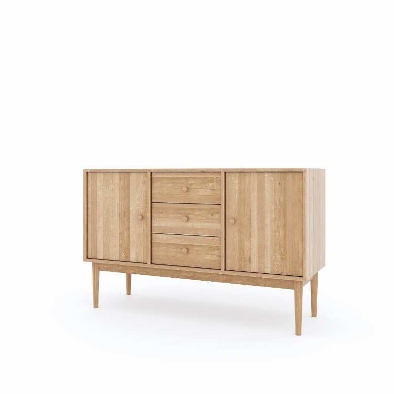 To komoda stworzona z myślą o tych, którzy potrzebują naprawdę dużej przestrzeni do przechowywania, ale nie chcą rezygnować ze stylu. Dwie zamykane szafki po bokach oraz trzy pojemne szuflady pośrodku tworzą idealnie zbalansowaną, funkcjonalną kompozycję. Dzięki temu komoda doskonale sprawdzi się zarówno w salonie, jadalni, sypialni, jak i w przestrzeni gabinetowej.