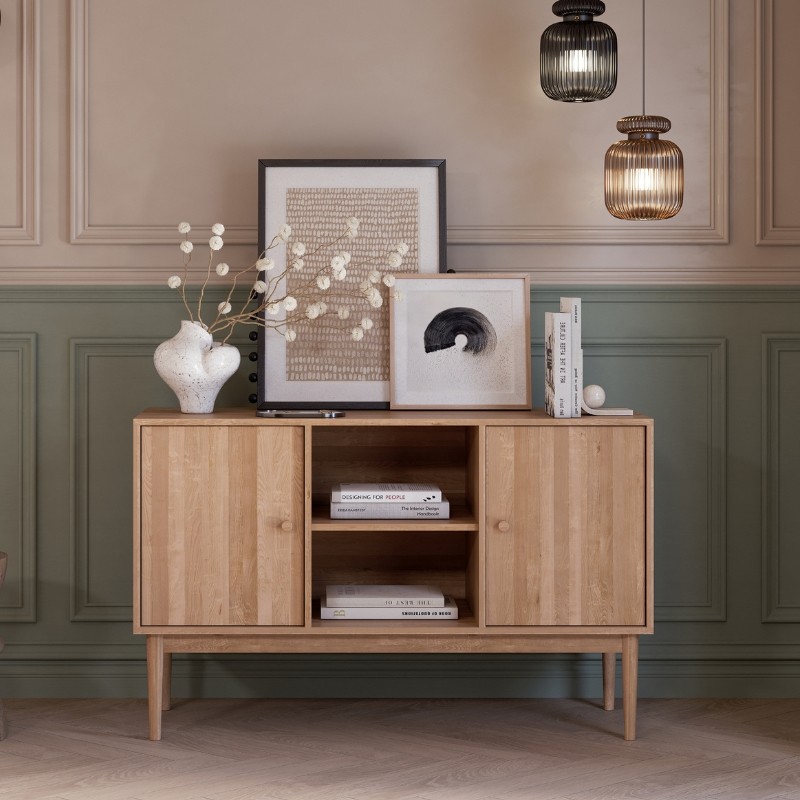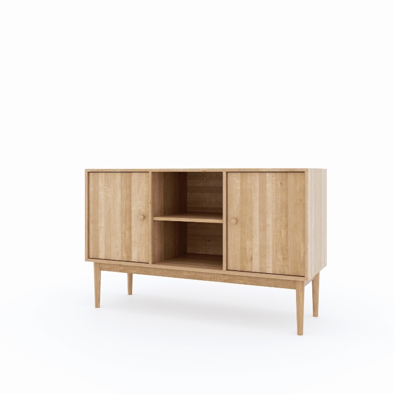 Wykonana z litego dębu i pokryta trwałym, ochronnym lakierem prezentuje się niezwykle elegancko, a jednocześnie pozostaje odporna na codzienne użytkowanie. Dwie pojemne szafki po bokach umożliwiają przechowywanie elektroniki, kabli, gier, akcesoriów i wszystkiego, co zwykle chcemy ukryć, aby zachować porządek. Centralna otwarta półka to idealne miejsce na dekoder, soundbar, odtwarzacz czy elementy dekoracyjne.