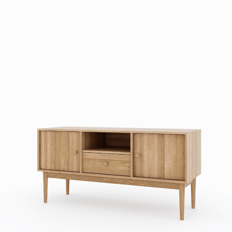Szafka RTV Oslo 2D+1 to połączenie minimalistycznej elegancji, ponadczasowego wzornictwa inspirowanego PRL oraz rzemieślniczej jakości polskiej produkcji. Wykonana z naturalnego, litego dębu i pokryta trwałym lakierem, zachwyca lekkością formy, proporcją i dopracowanymi detalami, które są charakterystyczne dla kolekcji Oslo.
