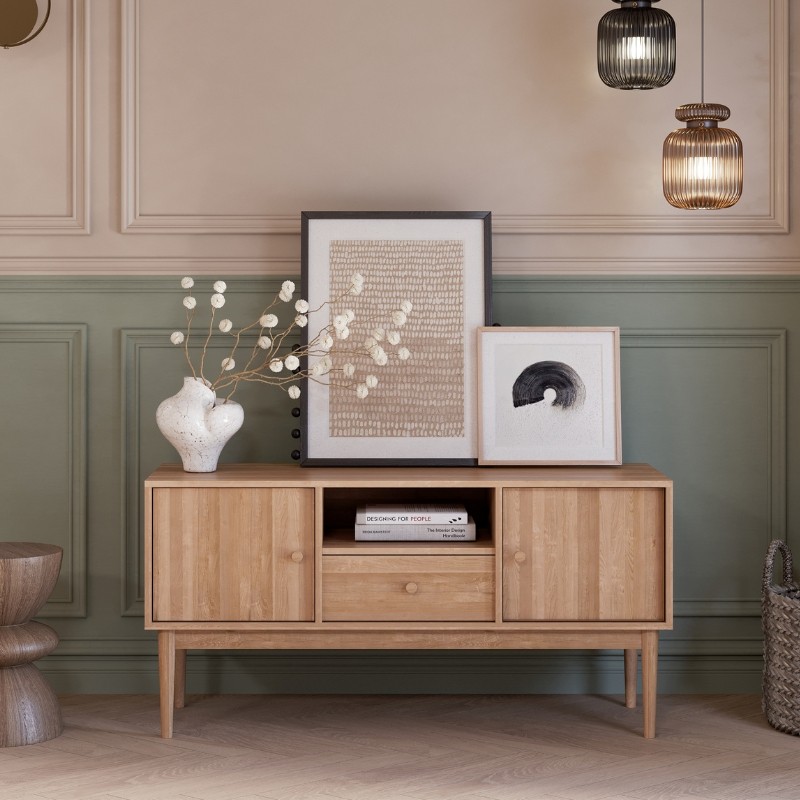 Smukłe nogi, drewniane uchwyty oraz wyraźne, naturalne usłojenie dębu nadają meblowi lekkości i skandynawskiego charakteru. To estetyka, która łączy współczesną prostotę z delikatnym, przyjemnym klimatem retro.