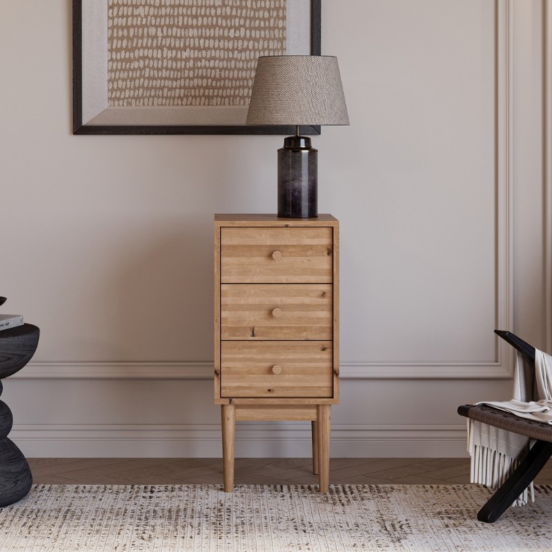Trzy pojemne, idealnie wyprofilowane szuflady pozwalają na wygodne przechowywanie wszystkich niezbędnych przedmiotów — od tekstyliów i dokumentów po akcesoria codziennego użytku. Smukłe nogi, minimalistyczne uchwyty oraz naturalne usłojenie dębu podkreślają skandynawski charakter komody, czyniąc ją stylowym dodatkiem zarówno do sypialni, salonu, gabinetu, jak i holu.