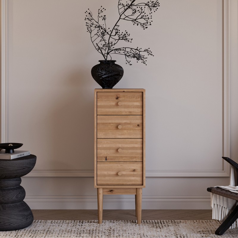 Cztery pojemne szuflady zapewniają wygodną przestrzeń do przechowywania odzieży, tekstyliów, dokumentów czy drobnych akcesoriów. Każda z nich pracuje lekko i pewnie, a okrągłe, drewniane uchwyty podkreślają charakterystyczny dla kolekcji Oslo skandynawski minimalizm. Subtelne usłojenie dębu sprawia, że komoda jest nie tylko funkcjonalnym elementem wyposażenia, ale również wyjątkową ozdobą wnętrza.
