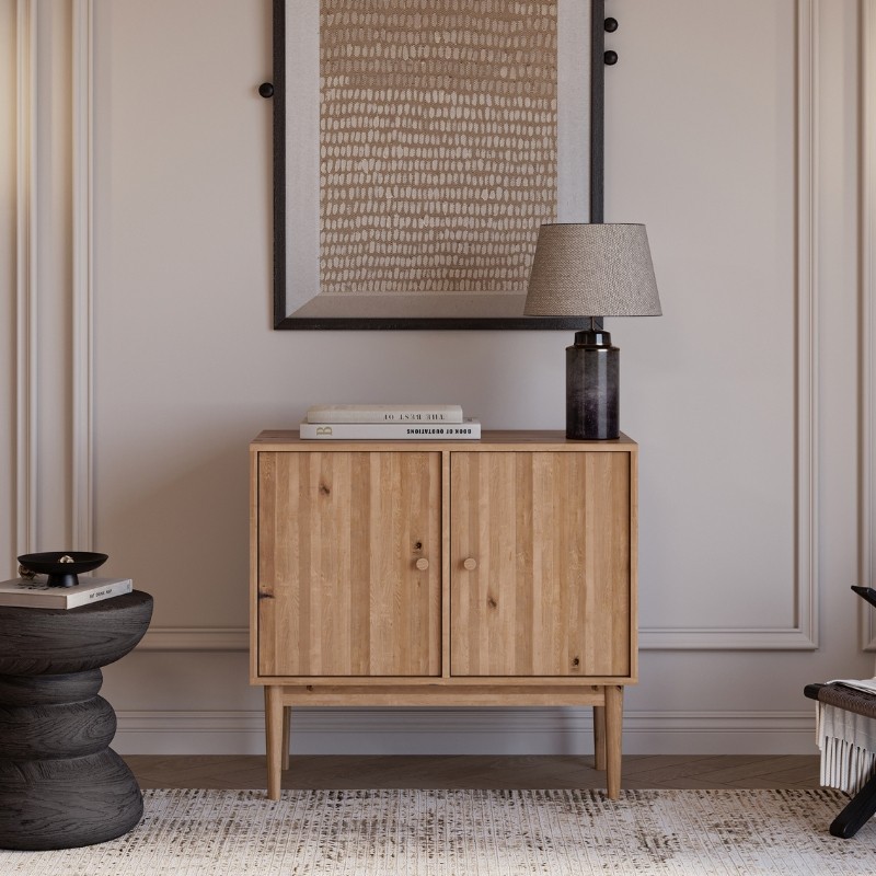 Za dwoma pełnymi frontami kryje się funkcjonalna i pojemna przestrzeń do przechowywania — idealna na porcelanę, tekstylia, dokumenty, sprzęt elektroniczny czy codzienne akcesoria. Naturalne usłojenie dębu dodaje komodzie wyjątkowości, czyniąc ją nie tylko praktycznym meblem, ale również elegancką ozdobą wnętrza. Minimalistyczne uchwyty oraz smukłe nogi podkreślają skandynawski charakter kolekcji Oslo.