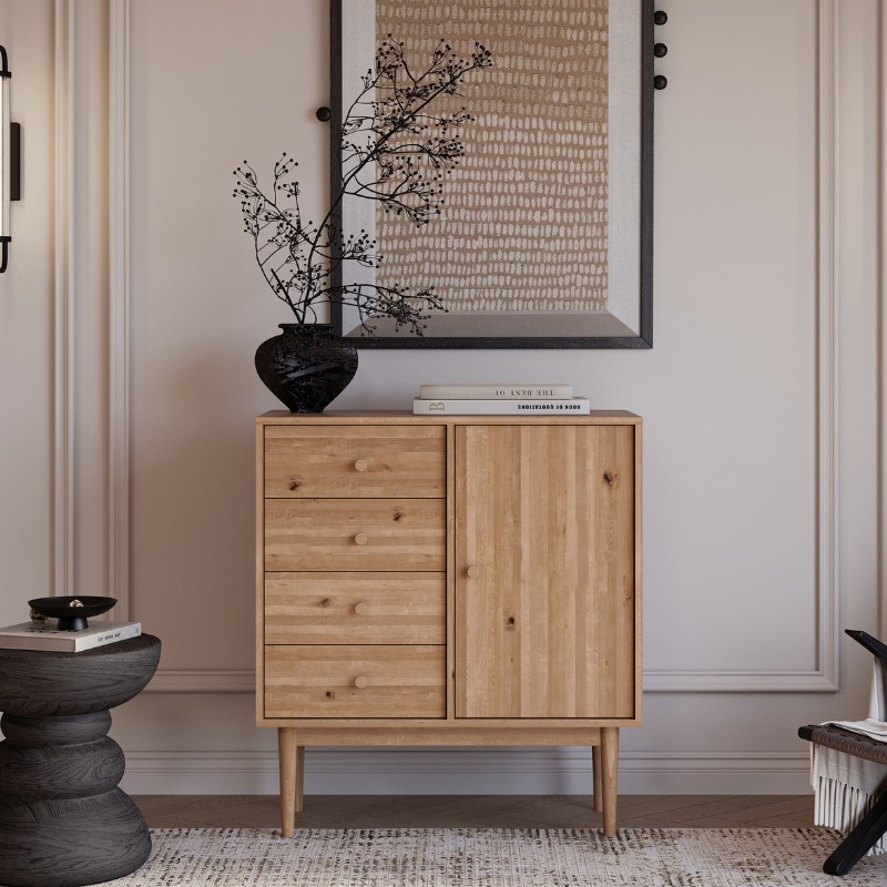 Cztery pojemne szuflady oraz przestronna szafka za pełnym dębowym frontem pozwalają wygodnie przechować zarówno drobne akcesoria, jak i większe przedmioty. Idealnie sprawdzi się jako komoda do salonu, jadalni, sypialni czy domowego gabinetu. Naturalne usłojenie dębu oraz subtelne drewniane uchwyty podkreślają jej elegancką, skandynawską estetykę.