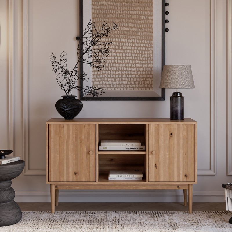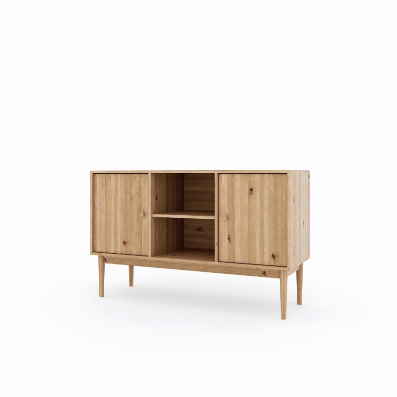 Wykonana z litego dębu i pokryta trwałym, ochronnym lakierem prezentuje się niezwykle elegancko, a jednocześnie pozostaje odporna na codzienne użytkowanie. Dwie pojemne szafki po bokach umożliwiają przechowywanie elektroniki, kabli, gier, akcesoriów i wszystkiego, co zwykle chcemy ukryć, aby zachować porządek. Centralna otwarta półka to idealne miejsce na dekoder, soundbar, odtwarzacz czy elementy dekoracyjne.