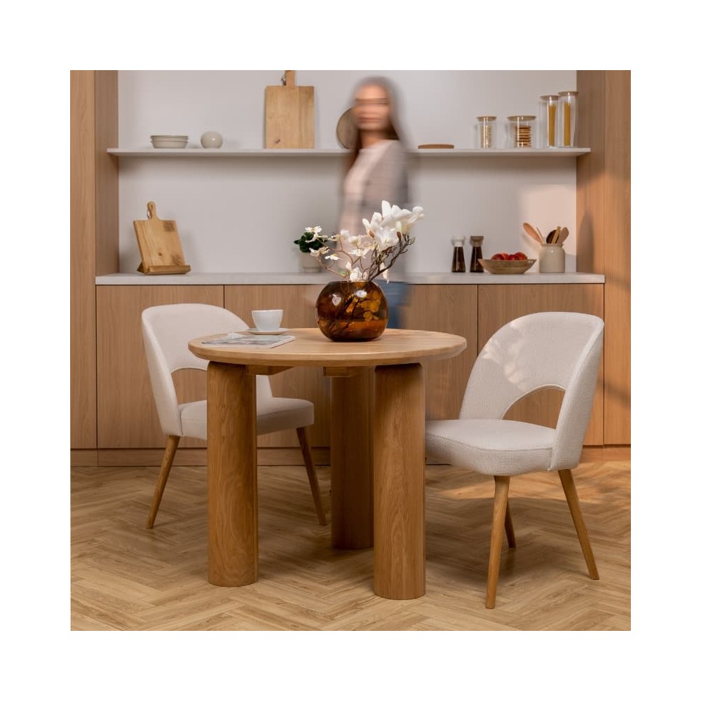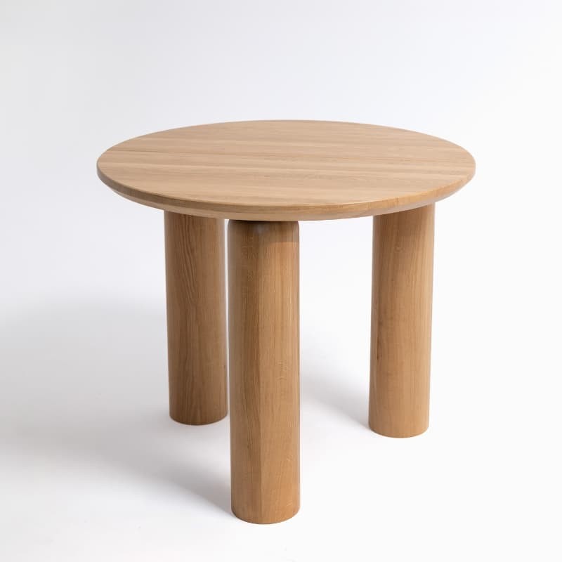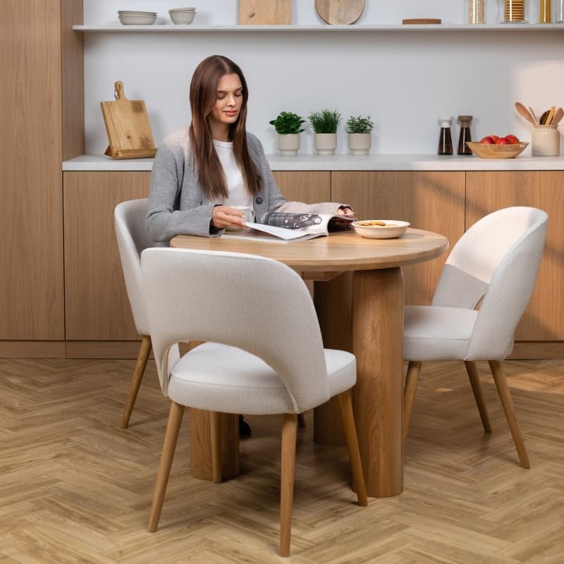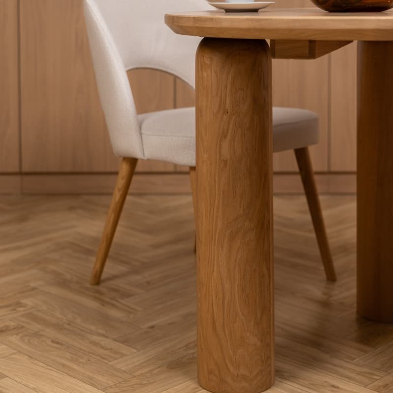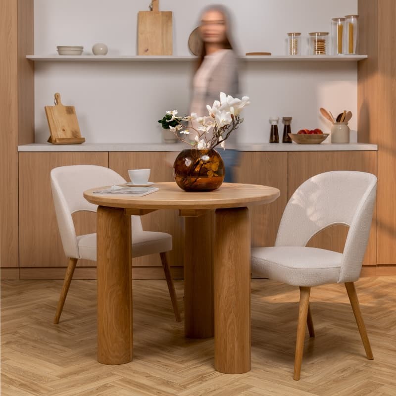 Blat stołu MOON wykonany jest z wysokiej jakości litego dębu, dzięki czemu każdy egzemplarz jest unikalny. Widoczne słoje i naturalna struktura drewna podkreślają autentyczność materiału i nadają wnętrzu przytulności. Solidne, cylindryczne nogi zapewniają stabilność, a jednocześnie nadają bryle nowoczesny, designerski wygląd.