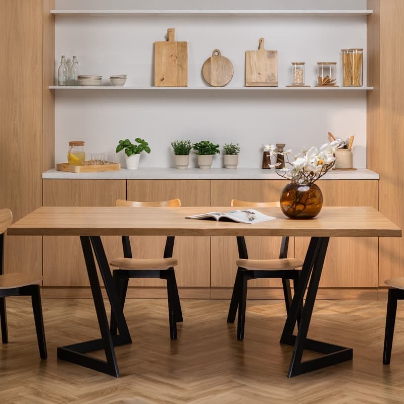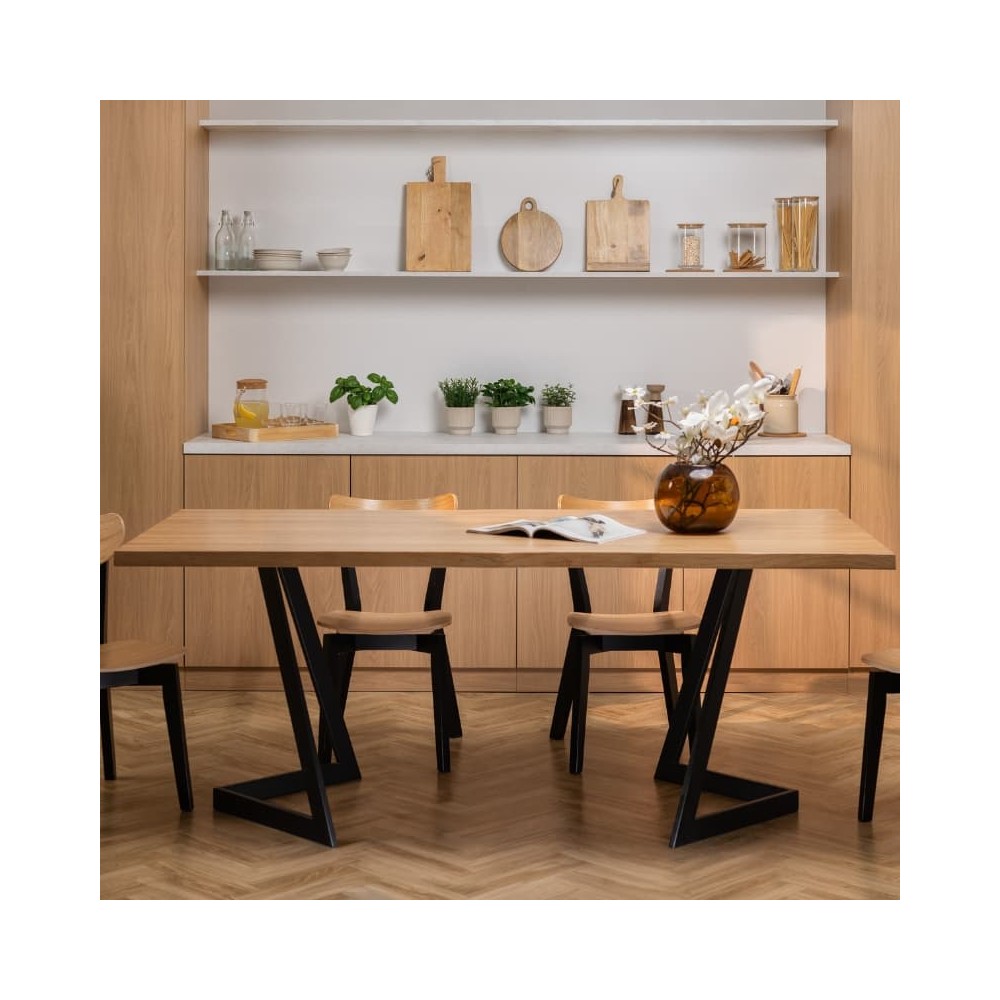 Stół z litego dębu na metalowych nogach typu V to połączenie naturalnego piękna drewna z nowoczesnym designem. Minimalistyczna forma i wyrazista podstawa nadają mu lekkości, a jednocześnie zapewniają stabilność i trwałość na lata.