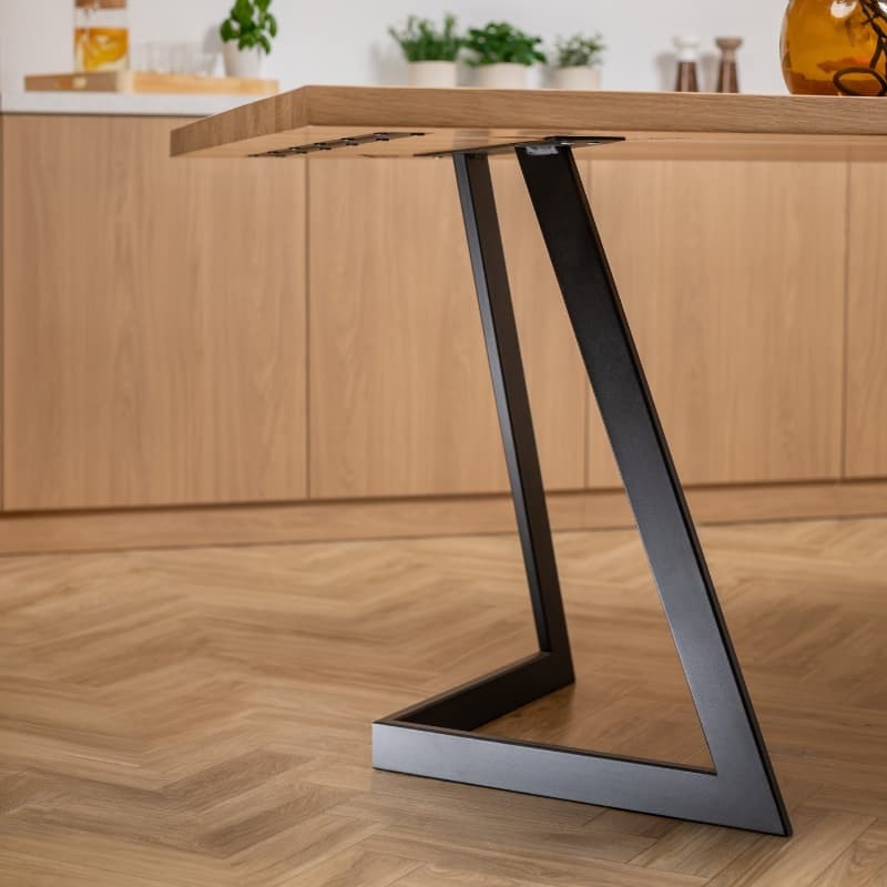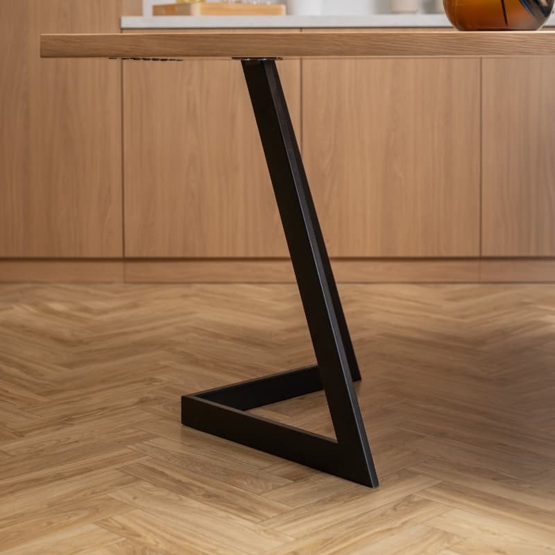 Charakterystyczne metalowe nogi w kształcie litery „V” malowane proszkowo to nie tylko solidne podparcie, ale także nowoczesny akcent wizualny. Konstrukcja zapewnia komfort użytkowania i swobodę ustawienia krzeseł, co sprawia, że stół doskonale sprawdzi się w jadalni, salonie lub przestrzeni biurowej.