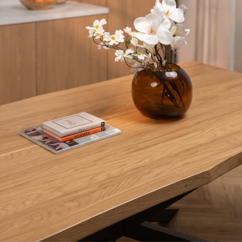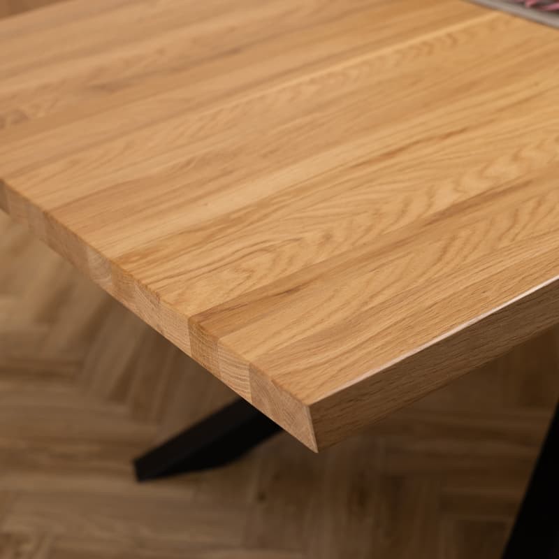 Blat wykonany z litego dębu zachwyca unikalnym rysunkiem słojów i ciepłą, naturalną kolorystyką. Każdy stół jest wyjątkowy – struktura drewna sprawia, że nie ma dwóch identycznych egzemplarzy. Solidne wykonanie gwarantuje trwałość i odporność na codzienne użytkowanie.