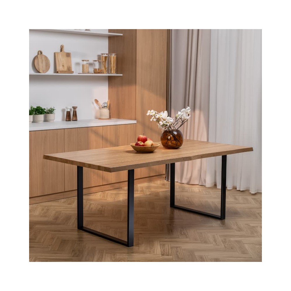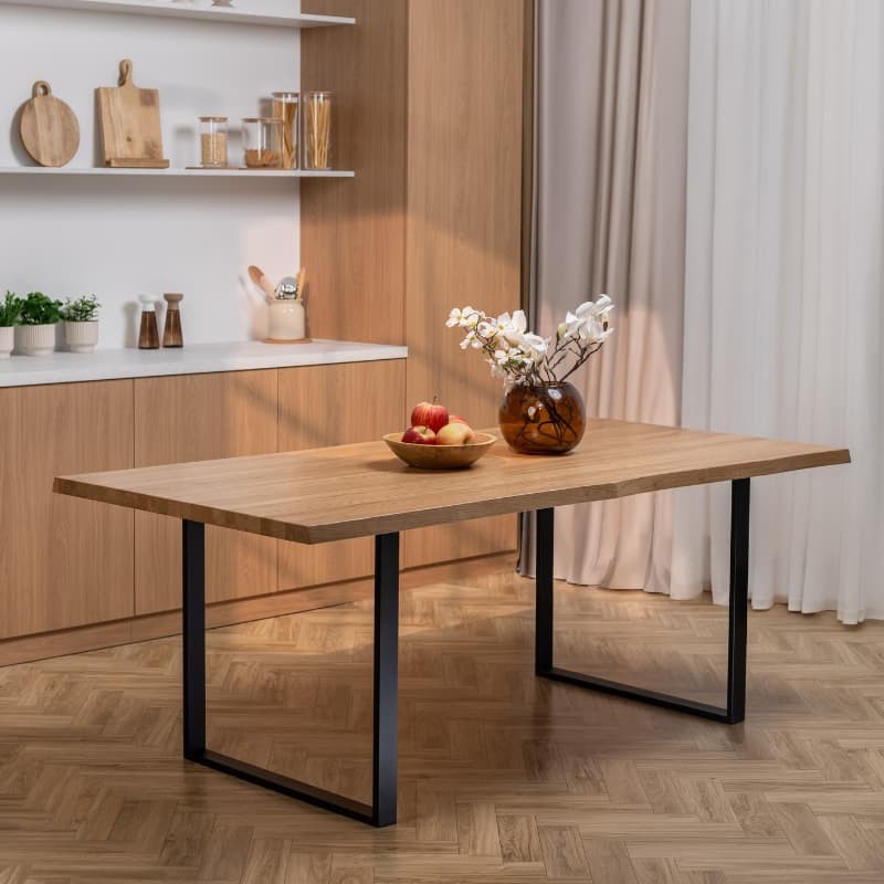Stół z litego dębu na metalowych nogach typu U to harmonijne połączenie naturalnego materiału z nowoczesną, minimalistyczną formą. Prosta konstrukcja podkreśla elegancję drewna i sprawia, że mebel doskonale wpisuje się w różnorodne aranżacje wnętrz.