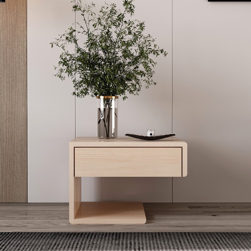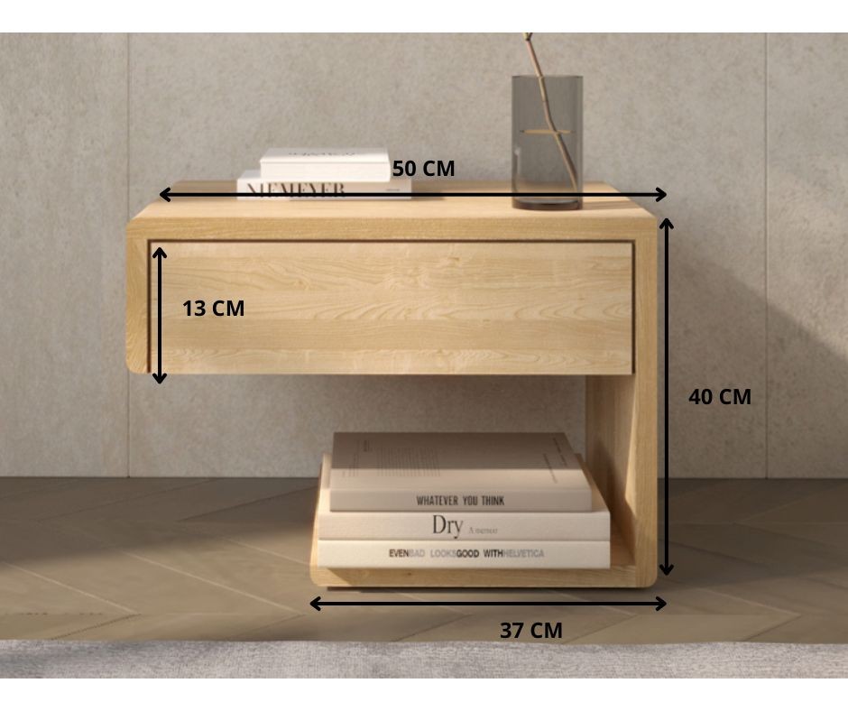 Model ZEN PLUS wyposażony jest w jedną pojemną szufladę, która pomieści niezbędne drobiazgi, oraz otwartą półkę pod nią – idealną na książkę, dekorację lub inne podręczne przedmioty. Całość wykończona jest trwałym lakierem, który zabezpiecza drewno i subtelnie podkreśla jego naturalny rysunek.