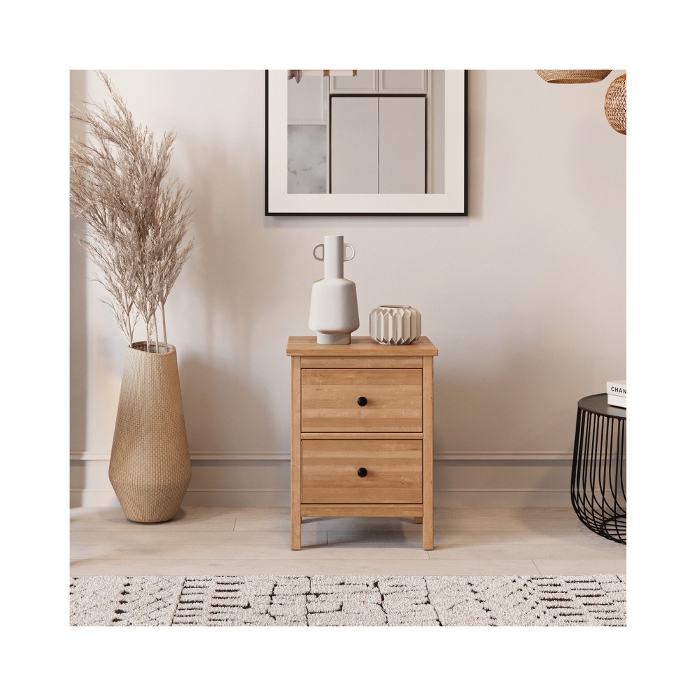 Lakierowana powierzchnia podkreśla piękno drewna i zwiększa odporność na codzienne użytkowanie. Dwie pojemne szuflady zapewniają wygodne miejsce na przechowywanie, a czarne metalowe gałki dodają meblowi nowoczesnego, eleganckiego akcentu.