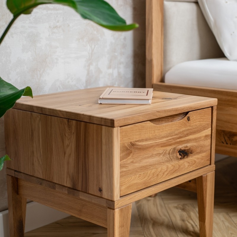 Mebel wykonany z litego drewna dębowego. Dzięki lakierowanemu wykończeniu, meble są odporne na zarysowania i łatwe w pielęgnacji.