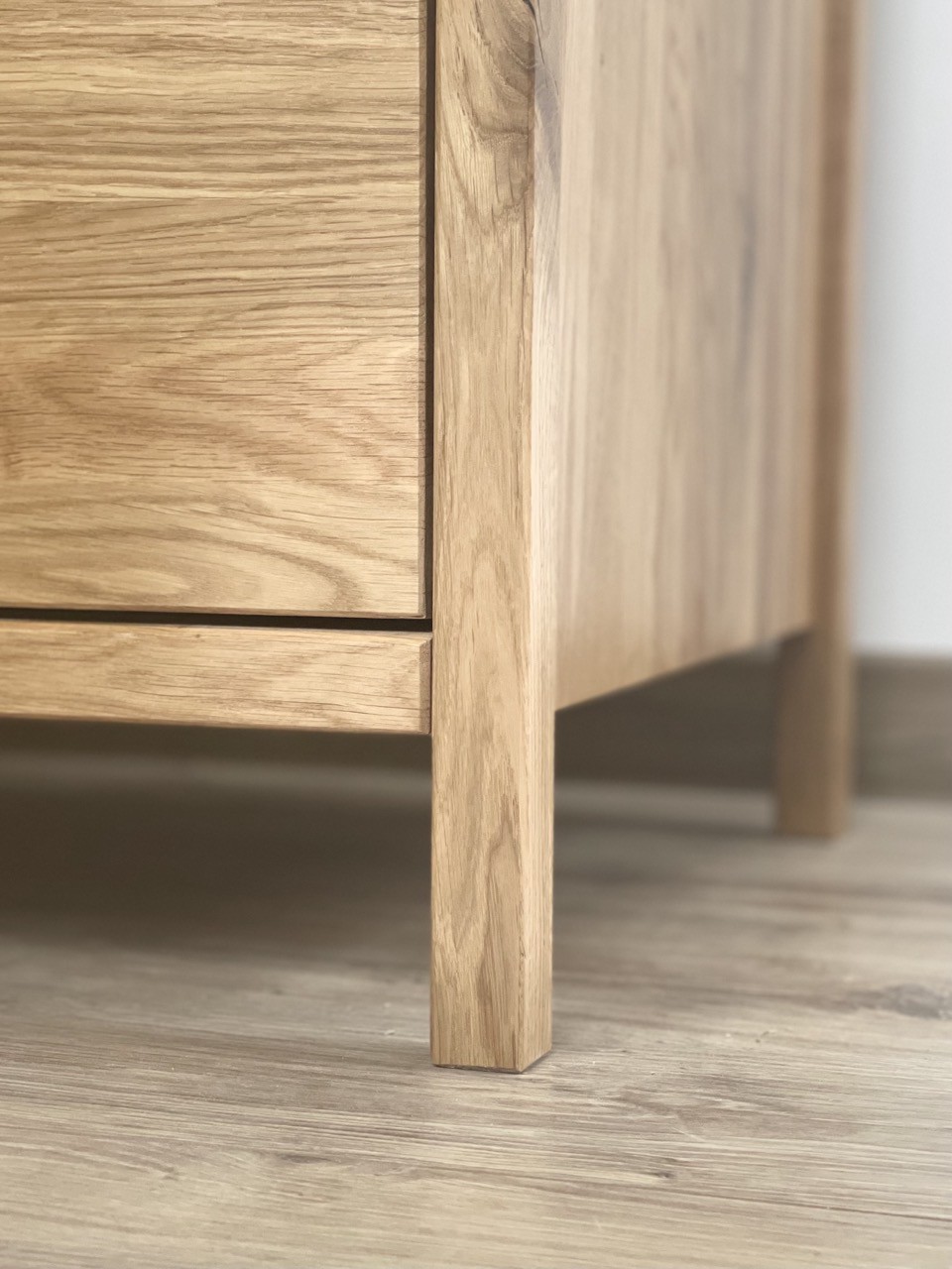 Naturalny rysunek drewna dębowego nadaje szafce ponadczasowy charakter, a lakierowana powierzchnia podkreśla jego kolor i chroni mebel podczas codziennego użytkowania. Czarne metalowe gałki stanowią elegancki kontrast i spójny detal całej kolekcji SCANDIC.