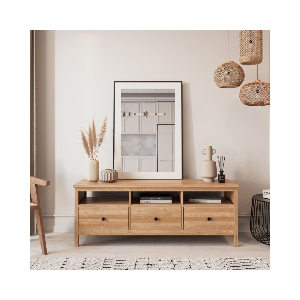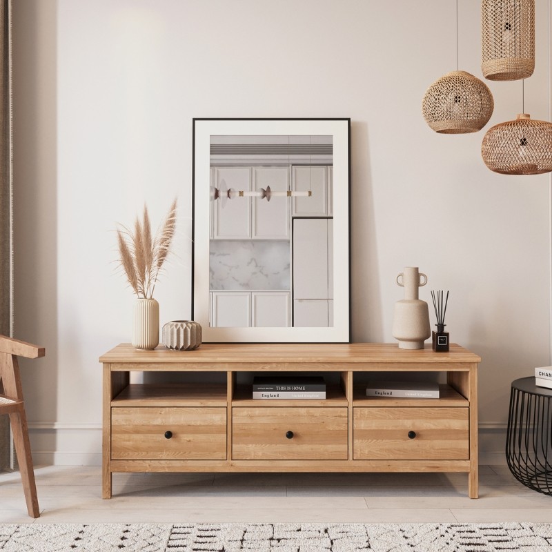 Otwarta przestrzeń nad szufladami umożliwia wygodne ustawienie dekodera, konsoli lub sprzętu audio, zapewniając swobodny dostęp i estetyczny wygląd. Trzy pojemne szuflady pozwalają na przechowywanie akcesoriów, pilotów, kabli czy dokumentów, pomagając utrzymać porządek w strefie wypoczynkowej.