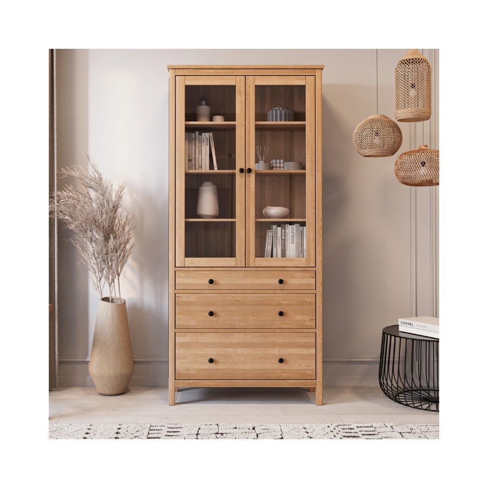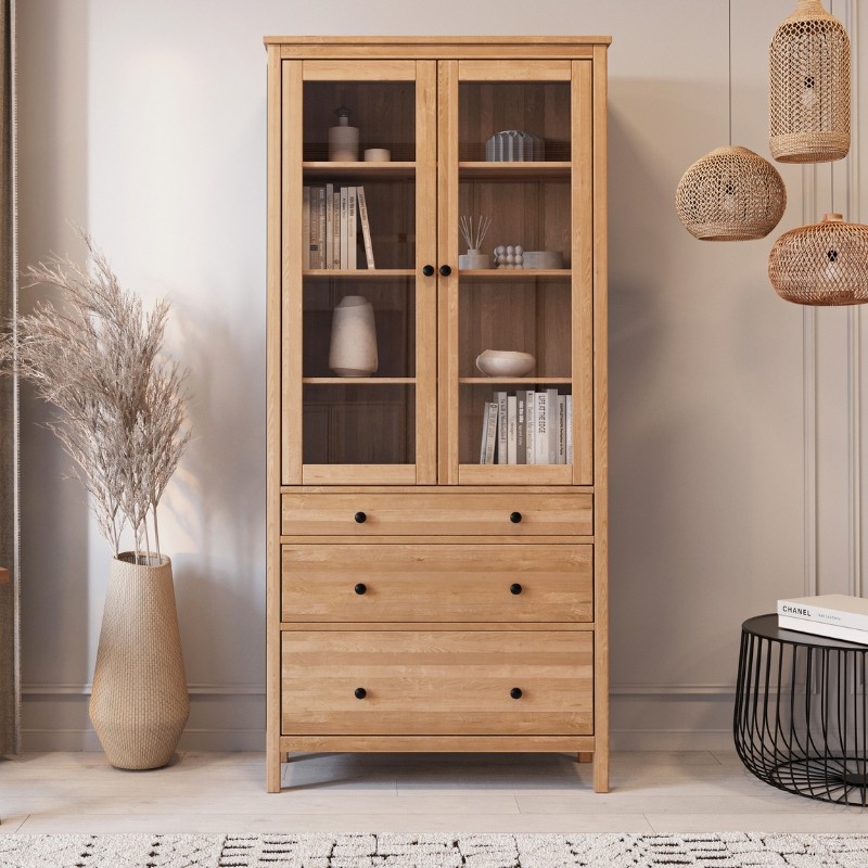 Górna część mebla zachwyca przeszklonymi drzwiczkami, idealnymi do eksponowania dekoracji, porcelany lub książek. Stabilne półki z litego drewna zapewniają duże możliwości przechowywania. Dolną część witryny uzupełniają trzy pojemne szuflady, które pomagają utrzymać porządek w codziennym użytkowaniu.